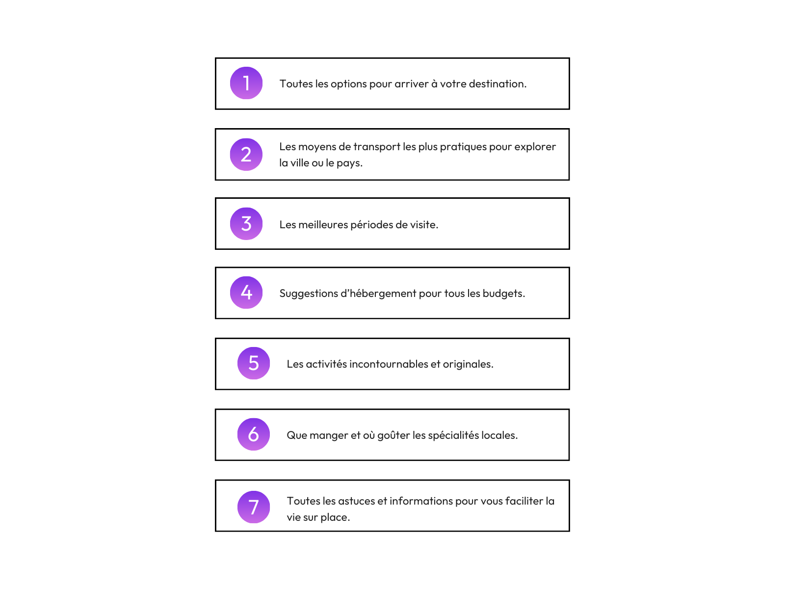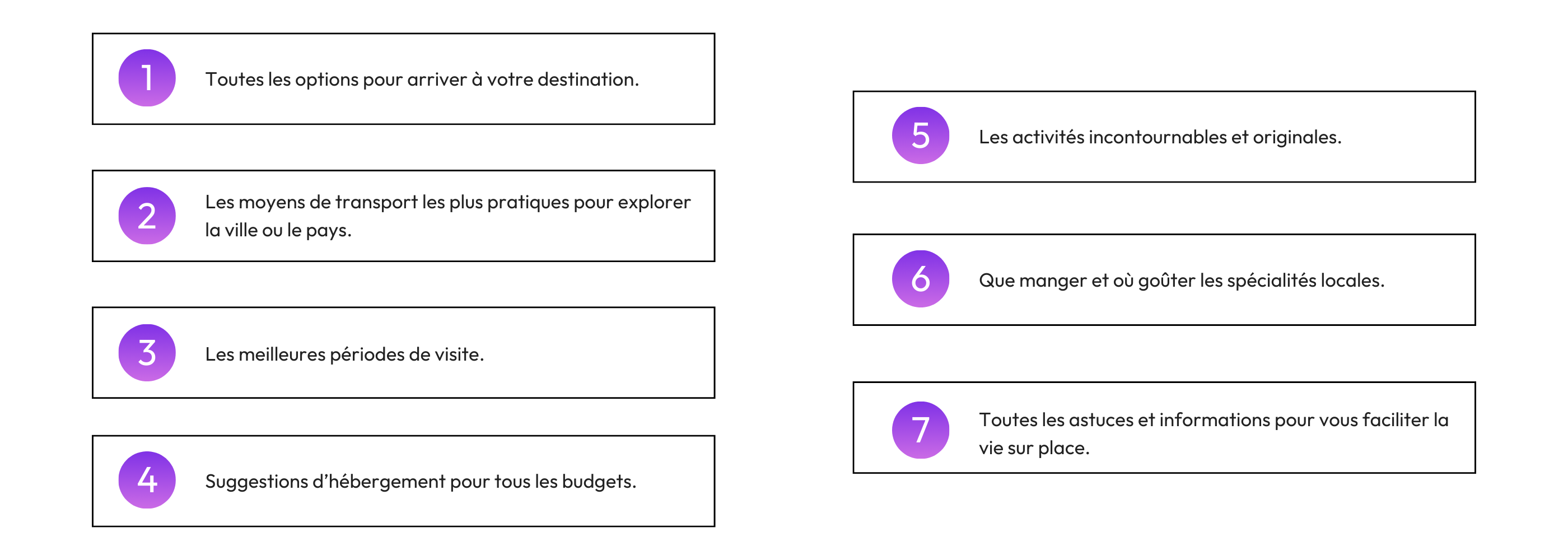 Découvrir nos guides ✈️Ce que vous trouverez dans tous nos guides :